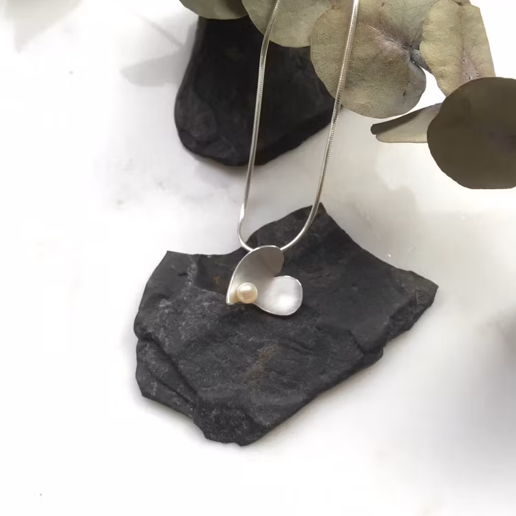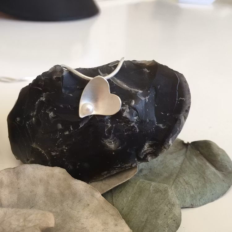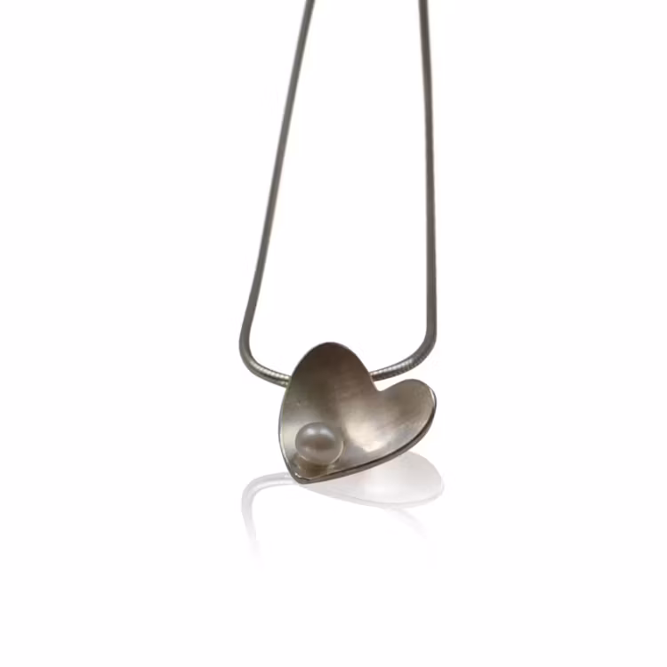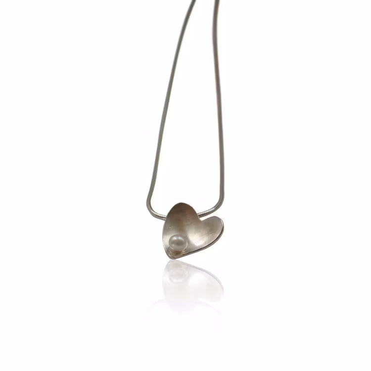En klassiker. Ett ljuvligt halsband i form av ett litet kupat silverhjärta i fri form med vit sötvattenpärla. Kort ormlänkskedja, 42 cm