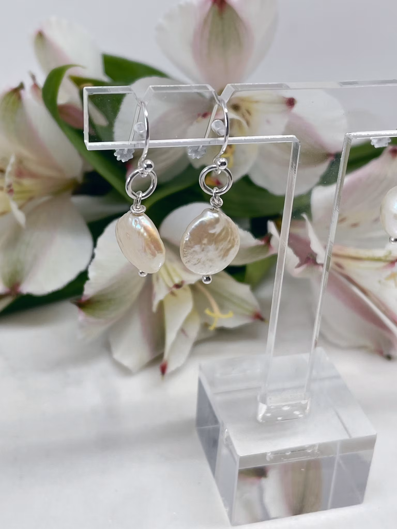 Örhänge med platt pärla som skimrar i off white/rosa. Örhänget sitter på en krok i sterling silver och är cirka 3 cm långt.