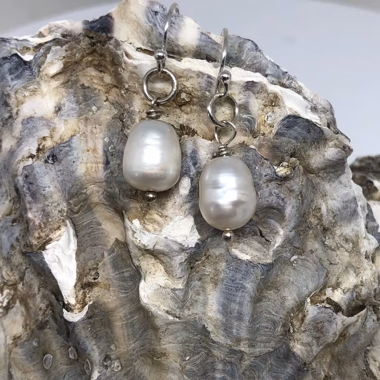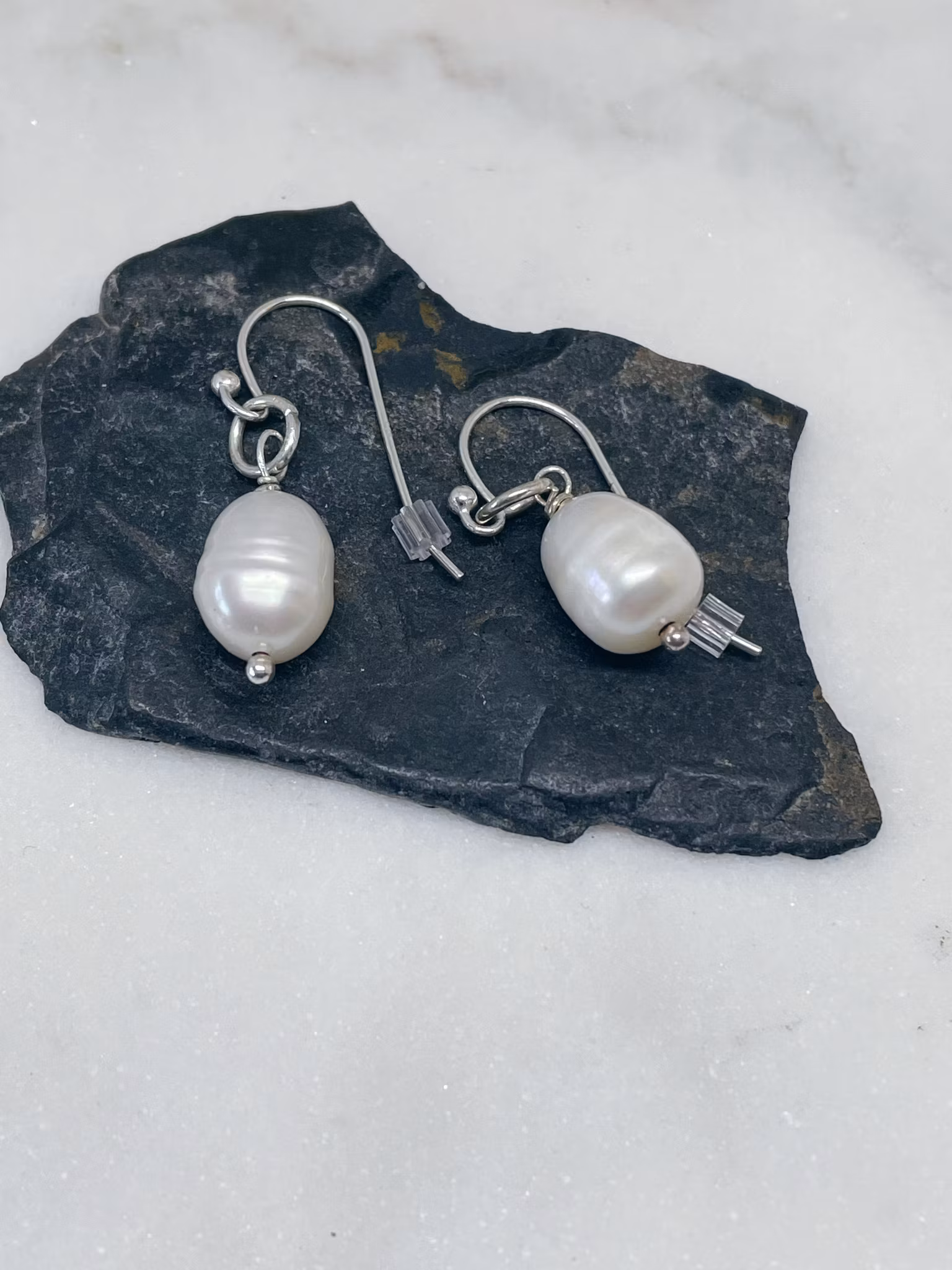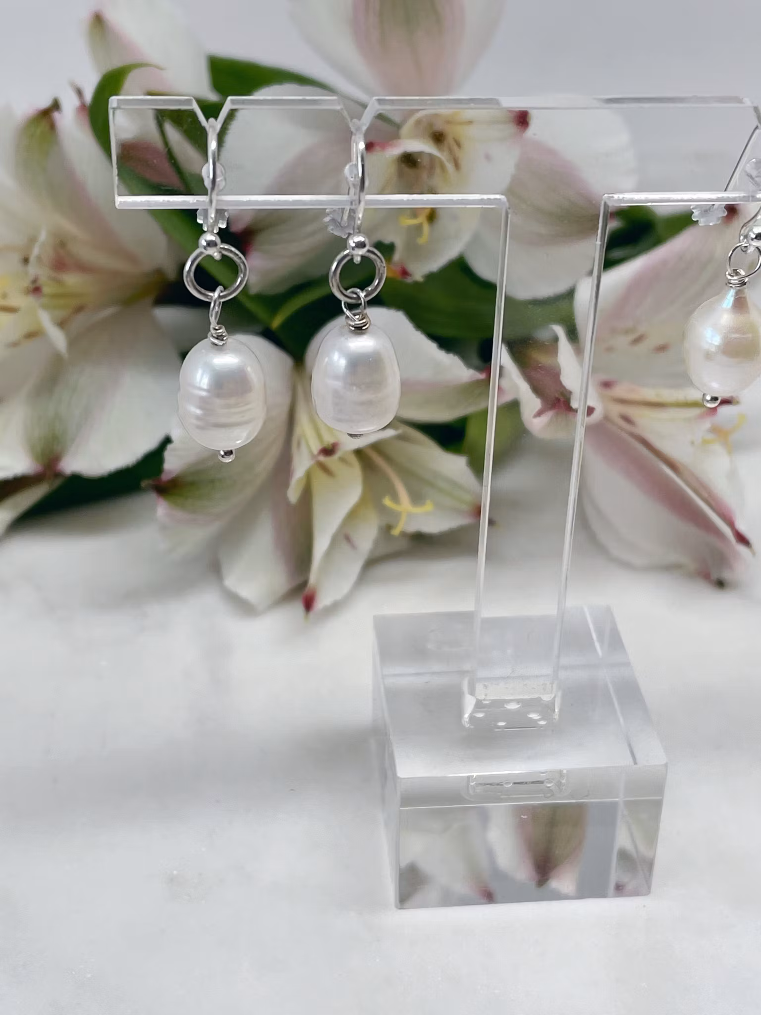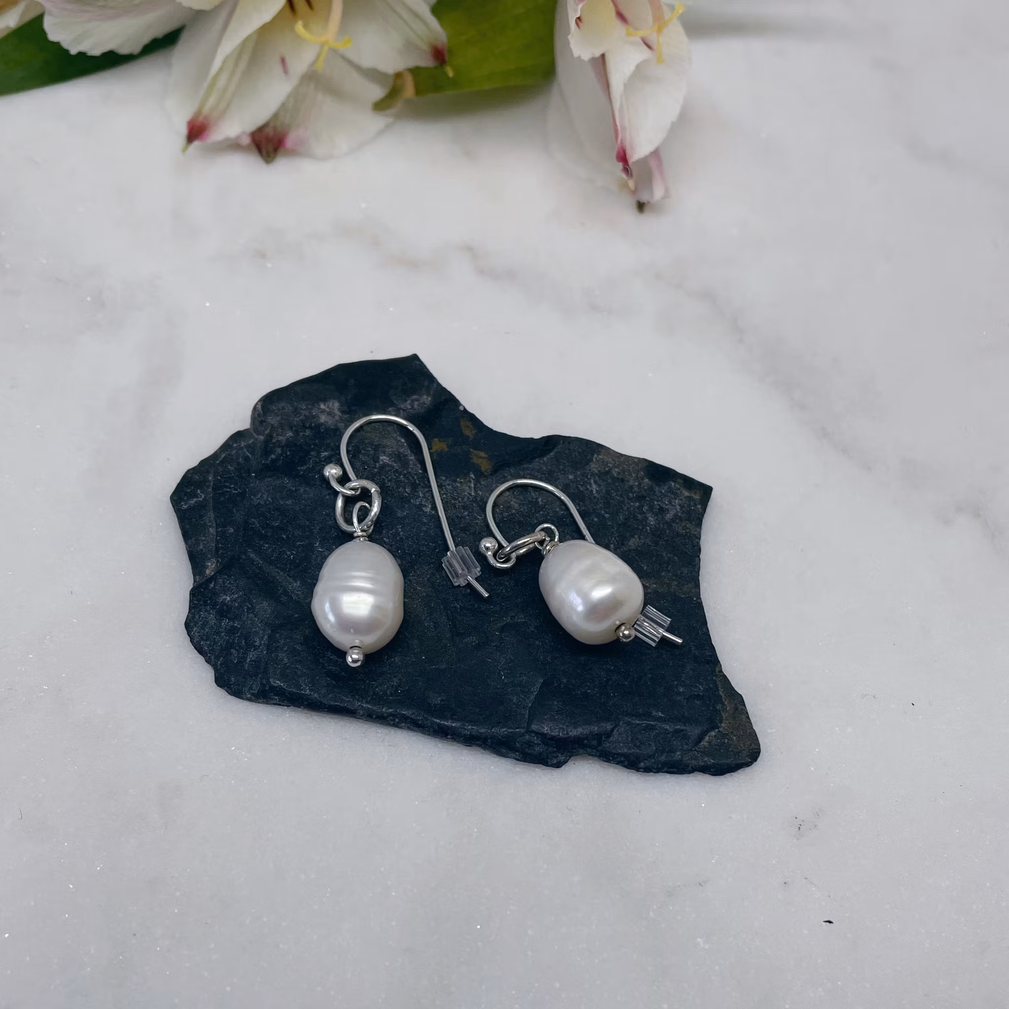 Örhänge med liten vit sötvattenpärla på krok. Pärlorna är lite olika varandra men matchar varandra i paret. cirka 1 cm långa. Sitter på en krok i sterling silver. Örhängets längd inkl. krok cirka 3,5 cm.