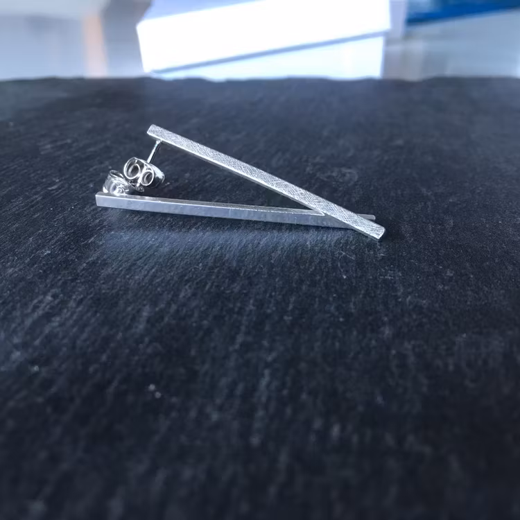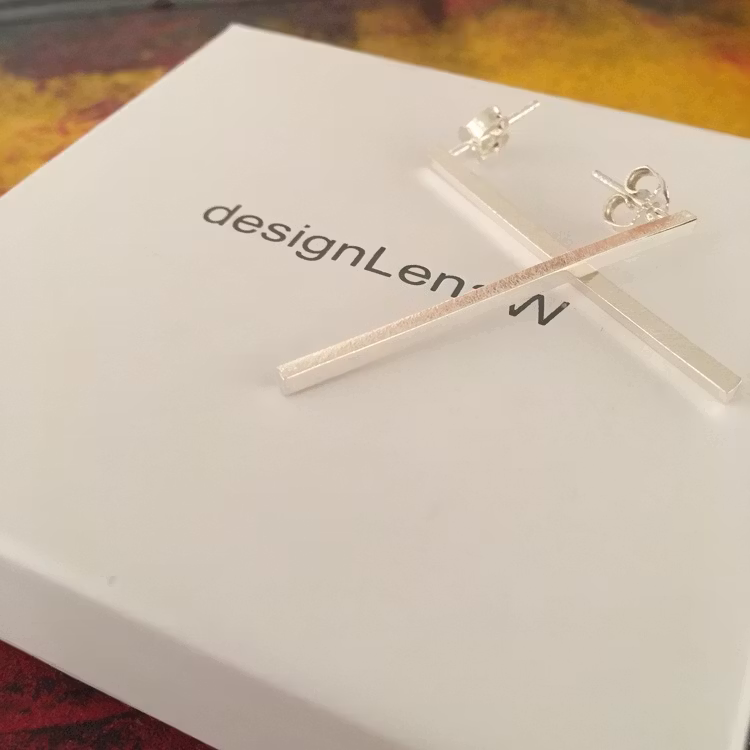 Serien Cityline - inspirerad av tavlan The Bridge av Laila Orning. Fångar storstadens raka linjer och arkitektur, passar in i stadens rytm och puls. Cityline raka örhängen är stilrena raka fyrkantiga örhängen med tre sidor som är filade kors och tvärs för att ge ett repat intryck och låta ljuset glitter, den fjärde sidan, framsidan är blank.Örhänget sitter på stift.