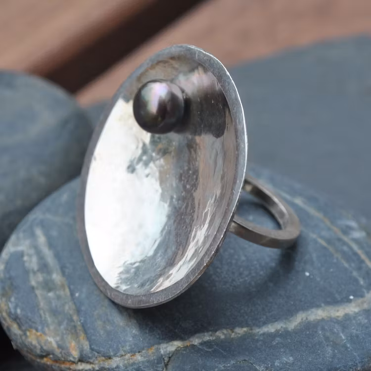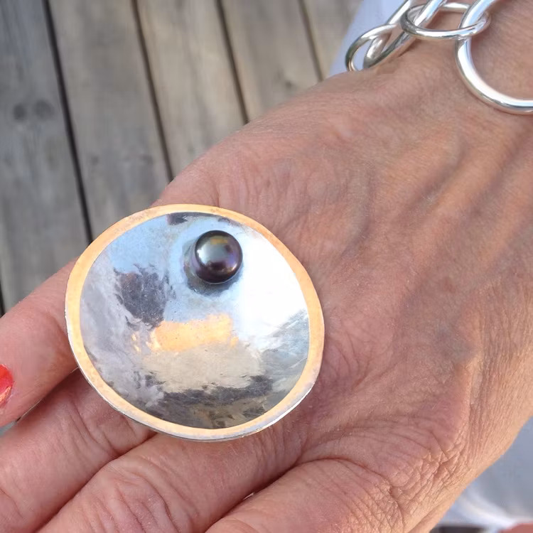 Ostronringen är ca 4 cm i diameter och har en hamrad, lite oregelbunden yta där det sitter en sötvattenpärla. Färgen på pärlan väljer du själv.